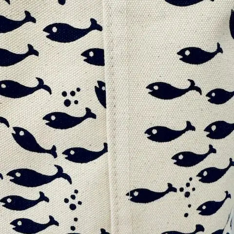 Print: 2 color screen print Size: 6" Tall 14" Wide 4" x 9.5" base 4" Deep Cute double-thickness leather handles Material: Heavy Cotton Canvas, Brass Hardware, Leather Detail Care: Spot Clean Only