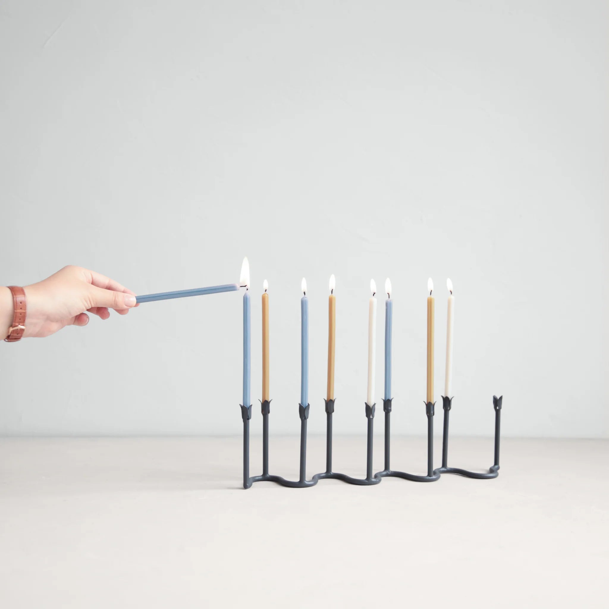 Our hand-forged wrought iron menorah is designed to hold nine Hanukkah Candles with elegant curves and tulip candle cups. Each menorah is entirely handmade using traditional methods—unique features and imperfections are to be celebrated. Gently press or pinch candle cups to secure candles as needed. Wipe clean with a soft cloth.
