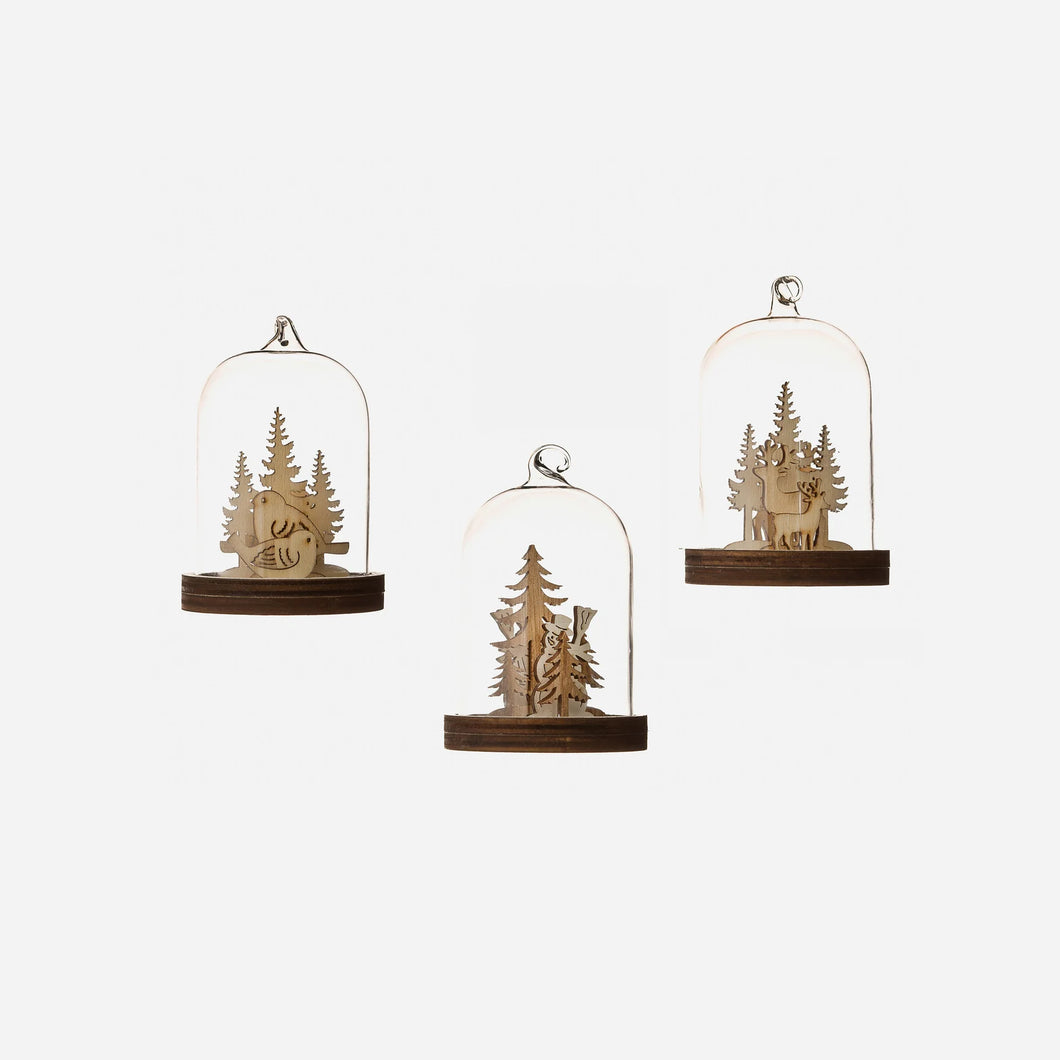 We love these woodland scenes encased in a glass dome to adorn your holiday trees or as holiday decor. Three styles available include Deer, Snowmen, or Bird.