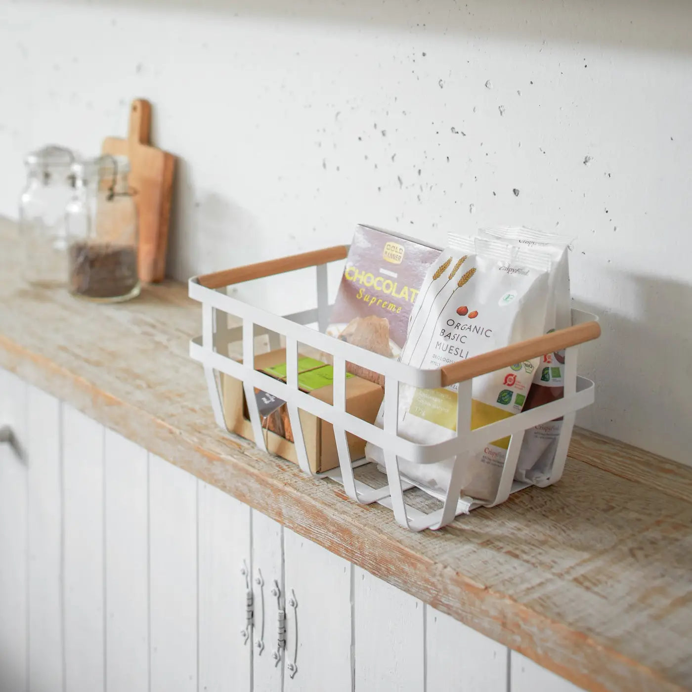Use this simple, stylish, and slim basket for storing anything in any room of the house. Store pantry essentials, or even slippers or flip-flops, to help organize, save space, and keep a tidier home. Product features warm wooden accents. In the case of this basket, wooden dowels act as handles, making it easy to carry from room to room.