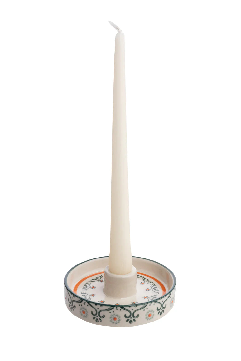 Experience understated elegance with our candle holder for stick candles, decorated with filigree hand-stamped patterns with subtle traditional charm!