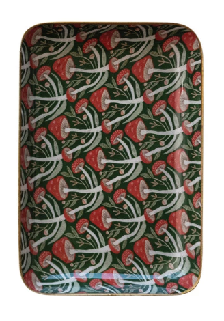 Enameled stainless steel tray with mushroom image/pattern & gold edge, 3 styles