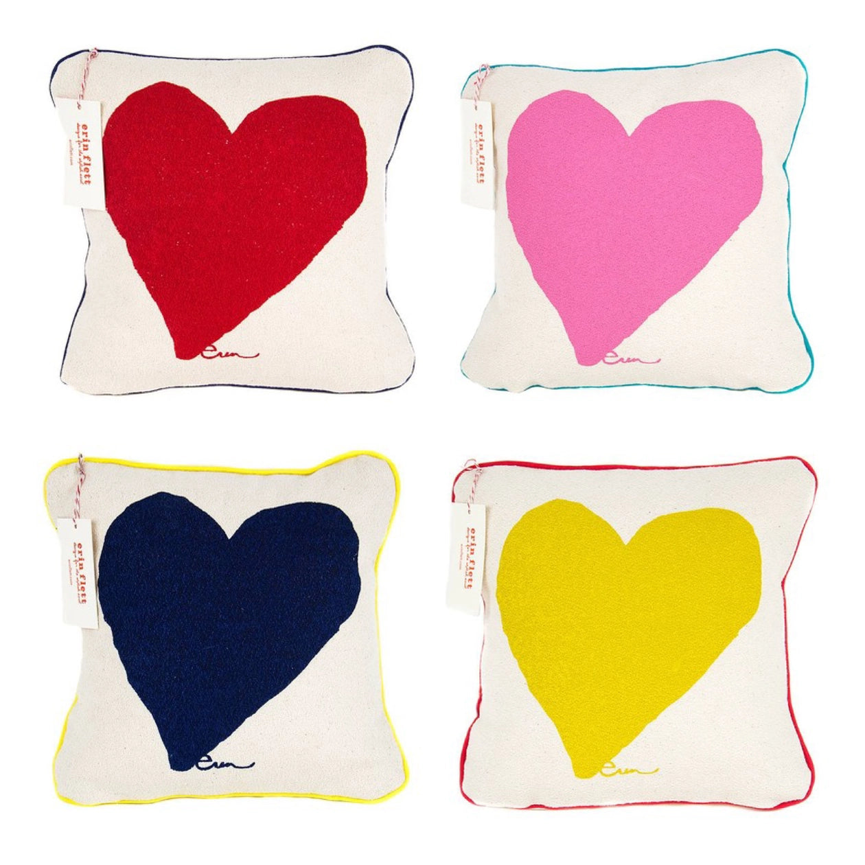 We love, love, love these mini heart throw pillows with contrasting piping and faux down insert included. Insert is removable with envelope closure. Hand printed and sewn in Maine.