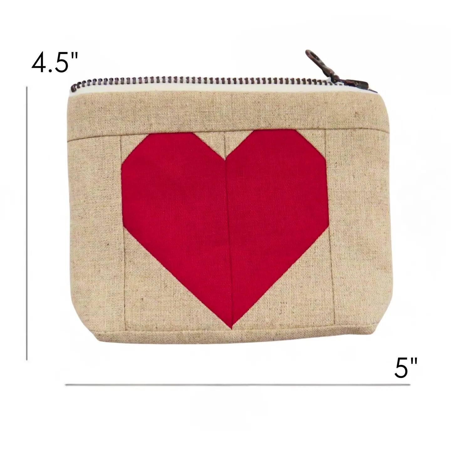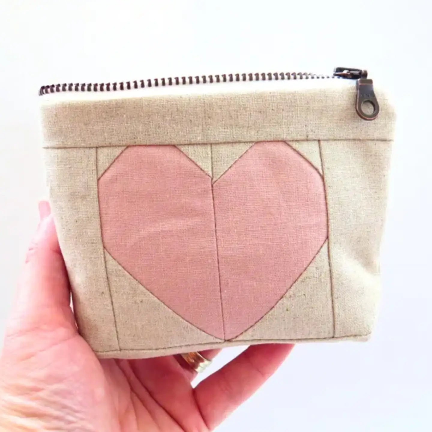 Timeless craftsmanship meets everyday function in this small, quilted pouch — handmade from a linen/cotton blend and pieced with a classic heart quilt block. The heart, a timeless symbol cherished across generations, is reinterpreted in a fresh, modern form.